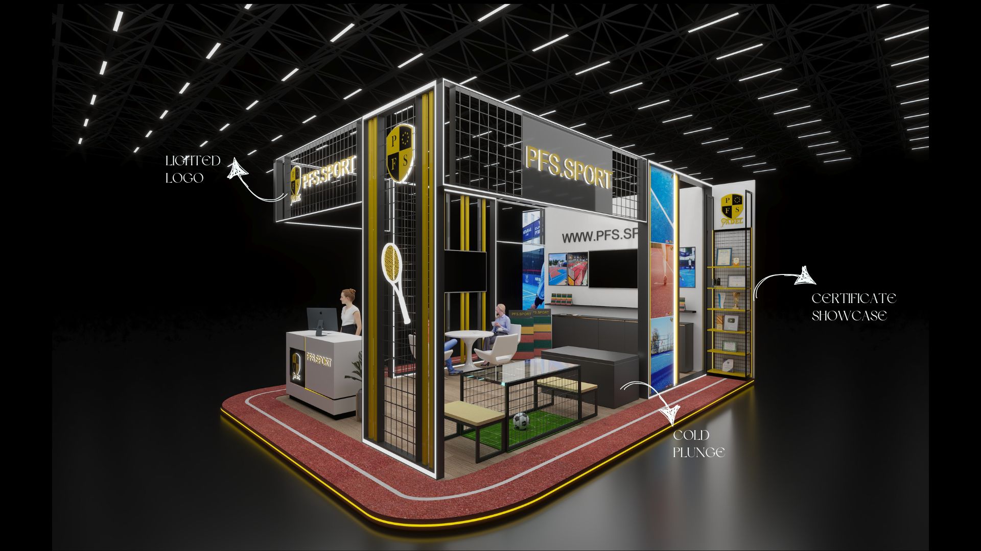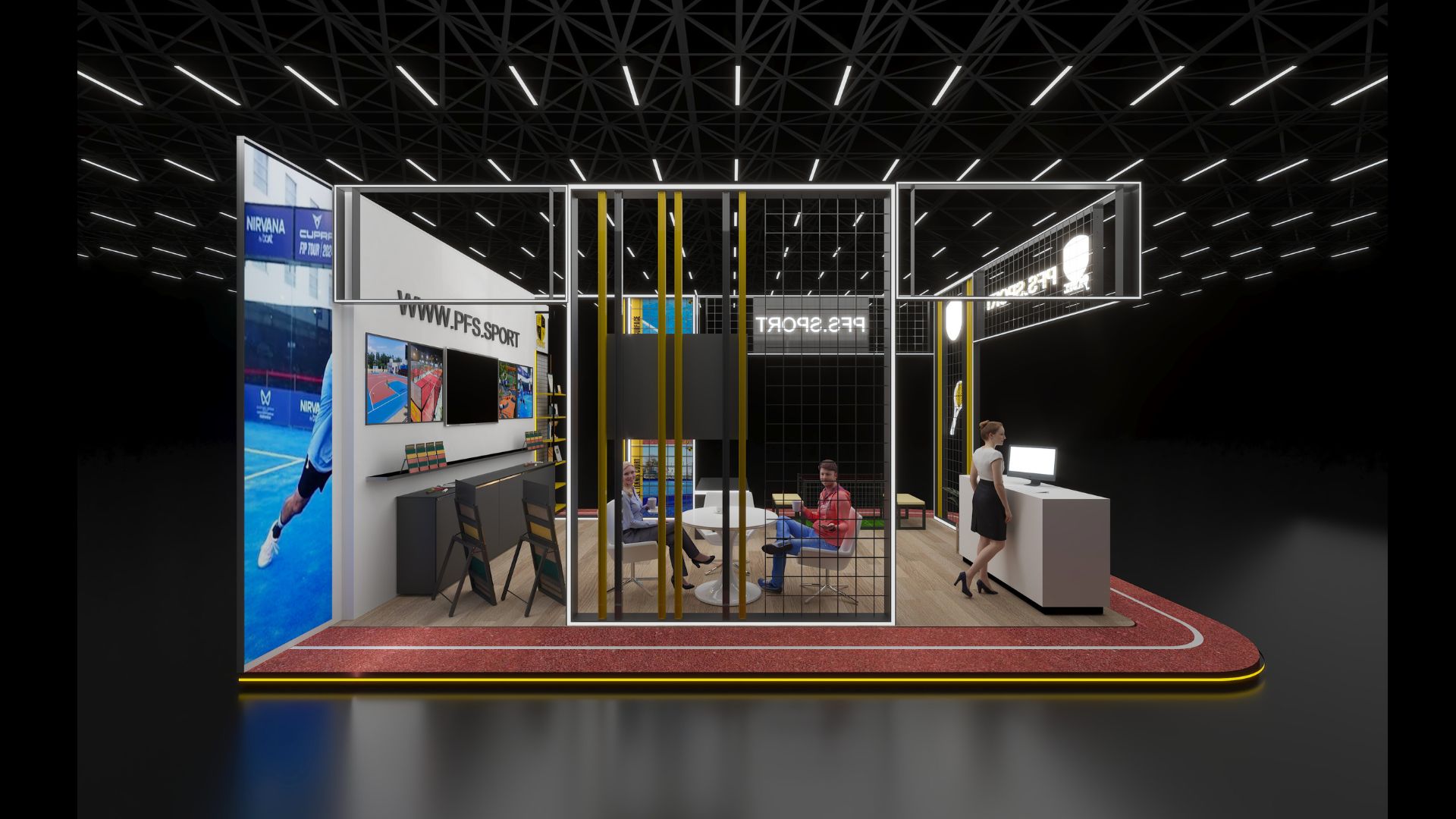 Strategic Branding: Prominent branding is seamlessly integrated into the design. A large, illuminated "PFS.SPORT" sign acts as the booth's crown jewel, while the brand's shield logo is featured on the reception counter and on interior signage. A stylized neon tennis racket adds another layer of visual interest, highlighting the brand's multisport focus.