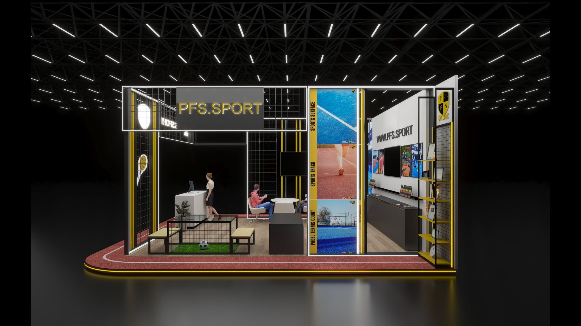 The objective was to design a compelling and functional exhibition booth for PFS.SPORT, a company specializing in sports surfaces and facilities. The design needed to be visually arresting, embody the brand's dynamic spirit, and create an engaging environment that would attract visitors and facilitate business conversations.